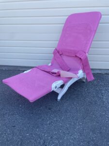 Reclining back, adjustable angled leg support, chest and hip straps