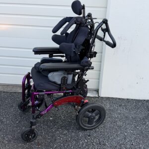 Seat width and depth is 13×13″ It has a harness, seat belt, lateral supports, headrest, wheelchair tie downs and is a tilt in space.