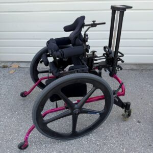 Has saddle seat, bi-directional wheels, chest support and a headrest